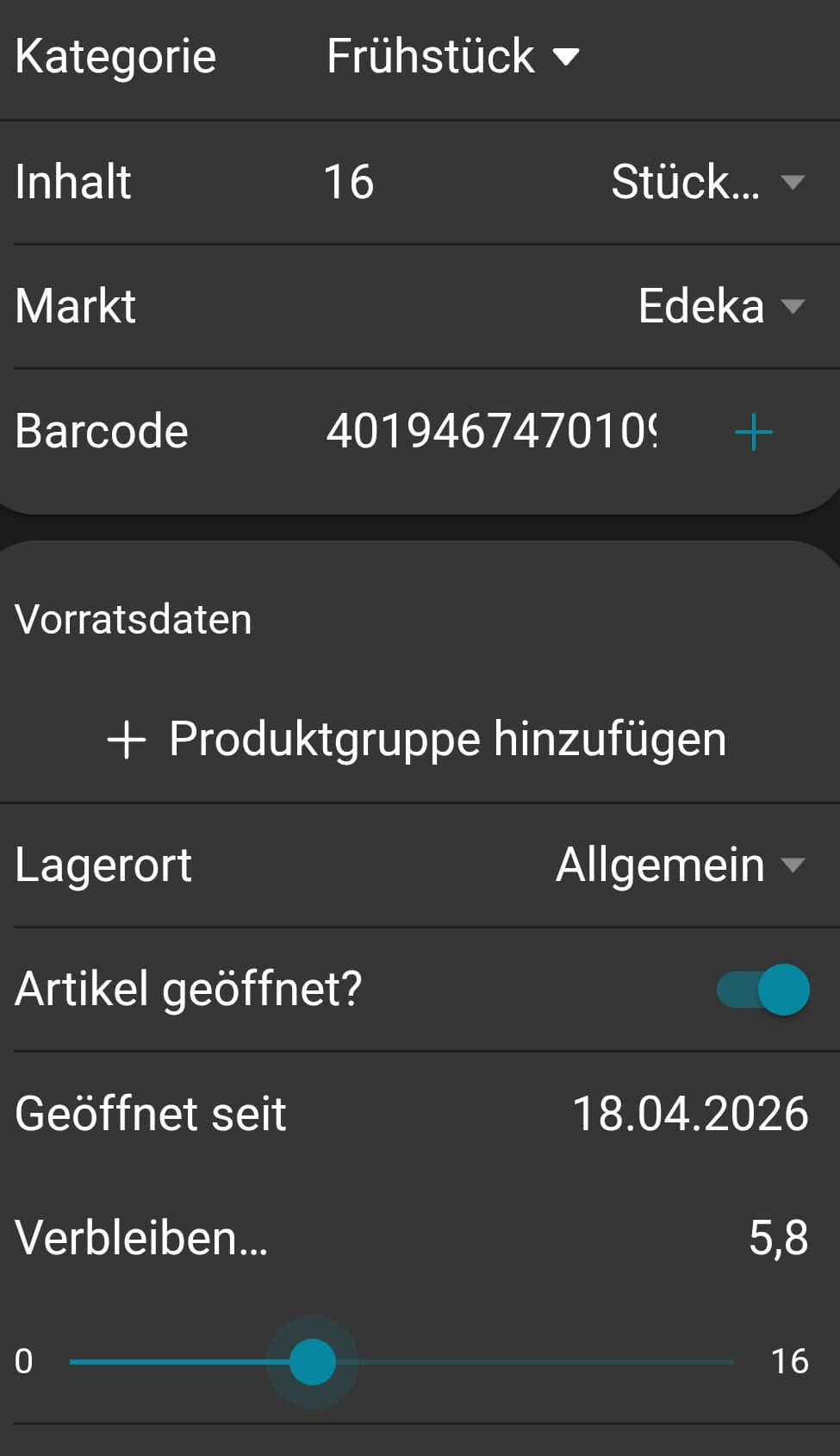 Ich habe z.B. eine Flasche mit 750 ml Inhalt, von der ich jeden Morgen ziemlich genau 40 ml entnehme. Wie kann ich schnell und fehlerfrei die Menge jeden Tag um diesen Wert herabsetzen? Wenn ich 0,75 l als Inhalt angebe, kann ich nur um jeweils 0,1 l verringern. Wenn ich als Stückmenge 20 eingebe - so viele Portionen sind es ca. - dann wird beim Regler jeweils um 0,1 gesenkt. Ich kann nicht nachvollziehen, wieso bei der Einheit “Stück” nicht auch jeweils ein Stück abgezogen wird, jedenfalls optional.